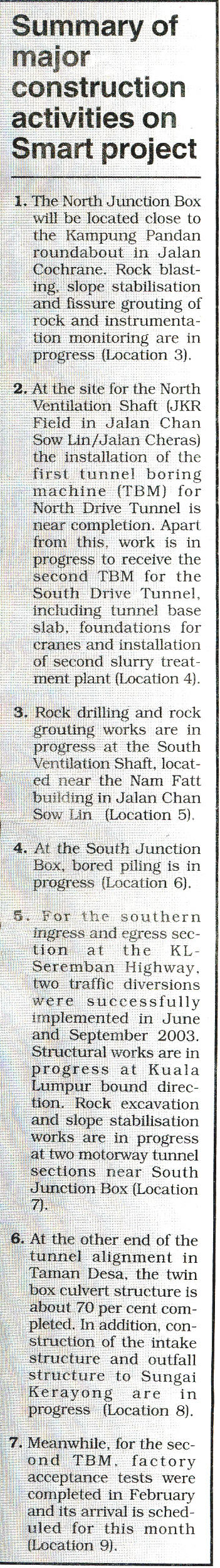 Summary of major construction activities on SMART project