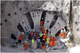 Workers from the tunnel boring machine coming out after the breakthrough event on 11 Dec 2004